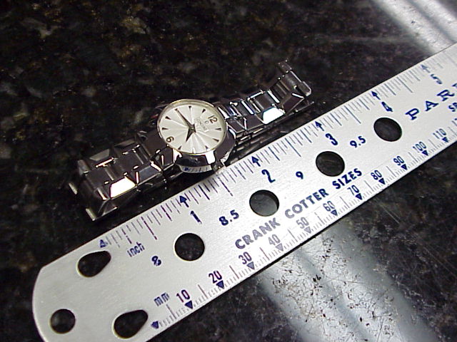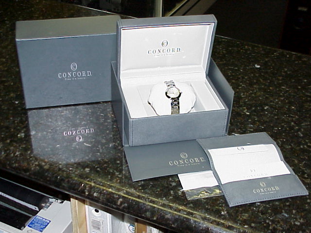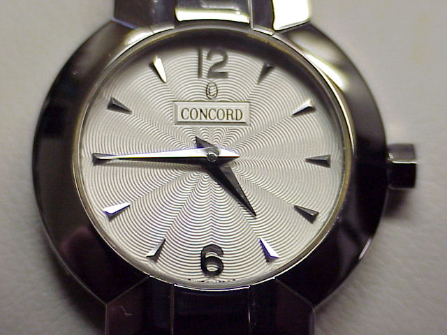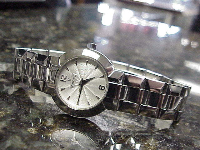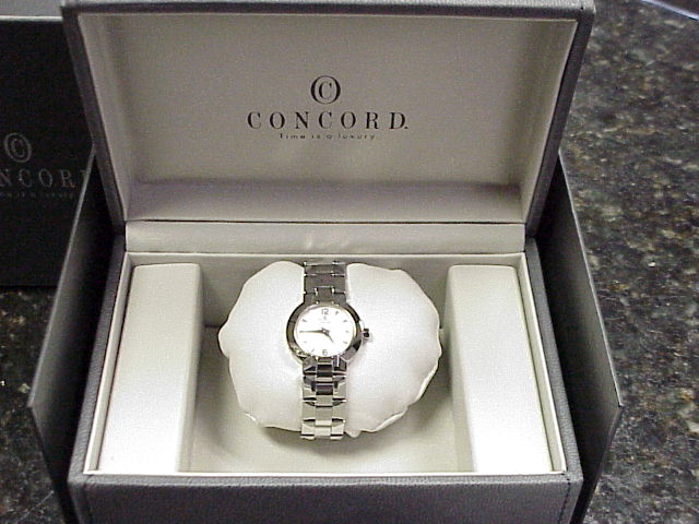 This watch is in primo/Mint condition and works perfectly. Original Box, Papers and extra link included. take a look at the Pictures below. Beset with elegance and sophistication... La Scala women's watch from Concord. Dramatic symmetrical form in lustrous polished steel. Perfectly round steel case is presented on the geometric, sculpted steel bracelet with beveled and contoured polished steel links. Raised, polished steel bezel frames the silver guilloche dial with silver colored hands and hour markers. Scratch resistant sapphire crystal. Bracelet has an invisible, double locking clasp for added security. Polished octagonal crown adds distinction. Water resistant to 30 meters (100 feet). Case is 26mm in diameter 5mm thick. |