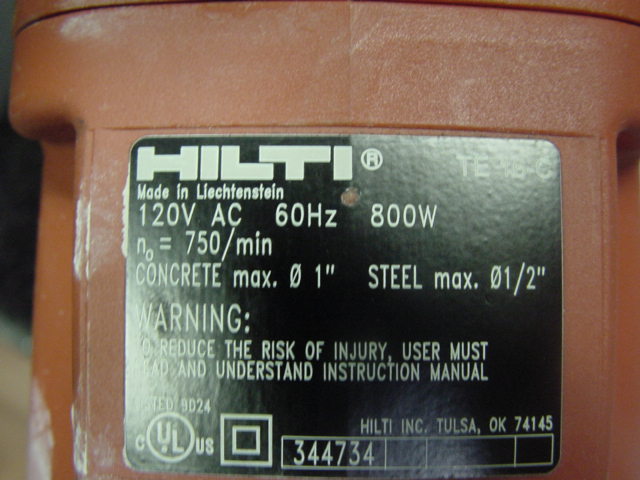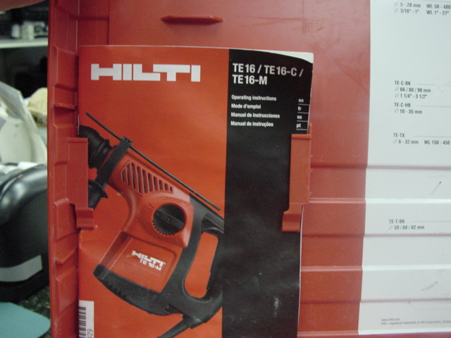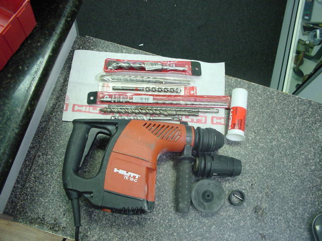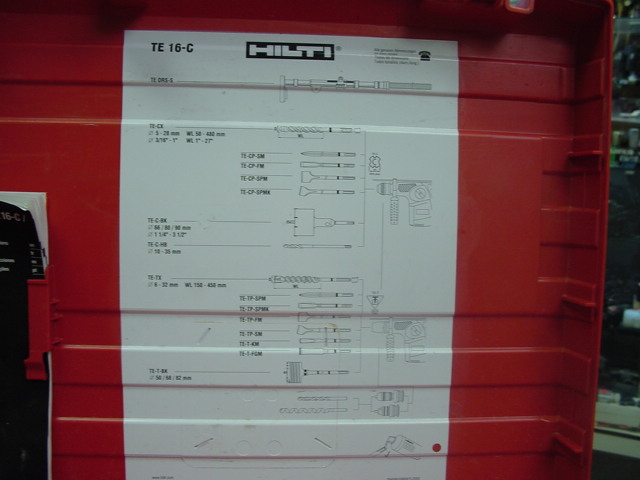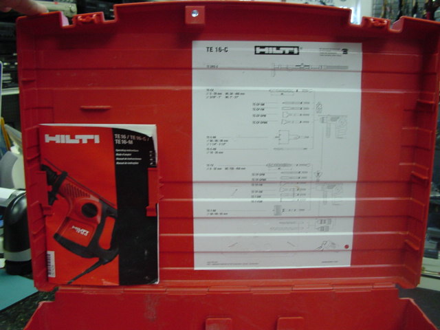 ![]() HILTI TE 16-C Uses: - Anchor holes and through holes in concrete and masonry using 5 - 28 mm diameter. TE-CX hammer drill bits (optimum performance with 10 - 20 mm diameter) - Coring in masonry with 66 - 90 mm diameter. TE-C-BK percussion core bits - Drilling in wood with 10 - 35 mm diameter. TE-C-HB forming / installation bits - Drilling in wood and metal (drill bits with smooth shanks up to 13 mm diameter) - Driving anchor screws and concrete screws - Light chiseling on masonry, finishing and cleaning up concrete with TE-C / TE-CP chisels - Plumbing, heating and air-conditioning installers - Hammering Speed Under Load 100% 4080 blows/minute Weight 3.85 kg Length 360 mm Width 90 mm Height 210 mm Optimum Drilling Range-Concrete 8 - 20 mm Drilling Modes Full rotary hammer, rotary only and chiseling function Bit Diameter Range-Steel Twist 3 - 13 mm Bit Diameter Range-Wood 5 - 25 mm Chiseling Performance Chisel adjusts to 12 positions Drilling Performance 360 mm / min in medium-hard concrete at 16 mm diameter Single impact energy 100% joules 3.2 J Reversing Switch Yes Radio and TV Interference Suppression As per EN 55 014 (VDE 0875) Variable Speed Switch Yes Number of Gears 1 Double Insulated Class II according to CENELEC / HD 4OO (EN 50 144) Speed 1 Under Load 0 - 750 rpm Package Contents BITES 1/4 inch